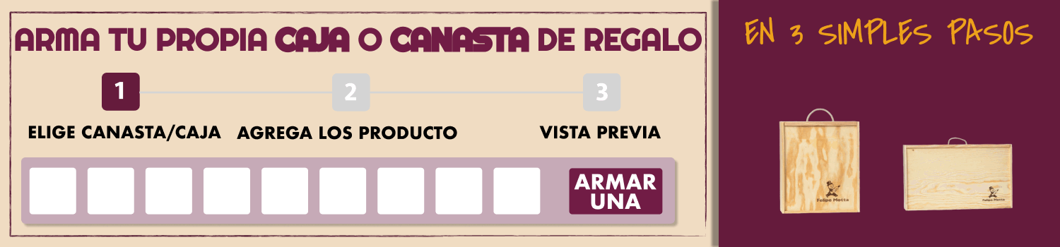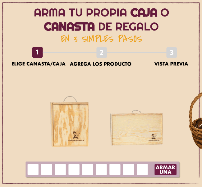 El servicio de Canastas Personalizadas está disponible exclusivamente en www.felipemotta.com en sucursales seleccionadas. La página utiliza una lista preseleccionada de productos disponibles según la sucursal. La disponibilidad de productos y bases puede variar por sucursal. Los tiempos de preparación y entrega pueden variar según la cantidad de canastas y los productos seleccionados. El equipo de Felipe Motta contactará al cliente una vez su pedido esté listo para retiro o para entrega. Los pedidos realizados pueden ser retirados sin costo en las sucursales participantes o entregados a una sola dirección. Para pedidos múltiples de una misma canasta, nuestro equipo se comunicará por correo para coordinar los detalles de las tarjetas personalizadas.